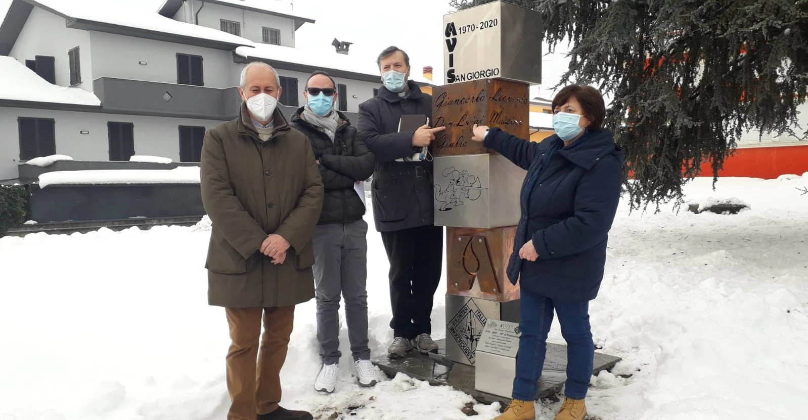“Avis 1970-2020”. Si distinguono queste date incise sul monumento dedicato ai donatori inaugurato mercoledì 30 dicembre davanti alla Sezione Comunale di San Giorgio. Una iniziativa fortemente voluta dai volontari e dal Presidente Leonardo Civardi poiché si inserisce nei festeggiamenti del Cinquantenario della fondazione della Sezione, una realtà che oggi conta oltre 130 iscritti. Mezzo secolo di attività evocati dalla scultura ideata dall’artista locale Alessandro Masera e raffigurante cinque cubi sovrapposti. “Un cubo per ogni decade di vita dell’Associazione”, spiega l’autore dell’opera.
