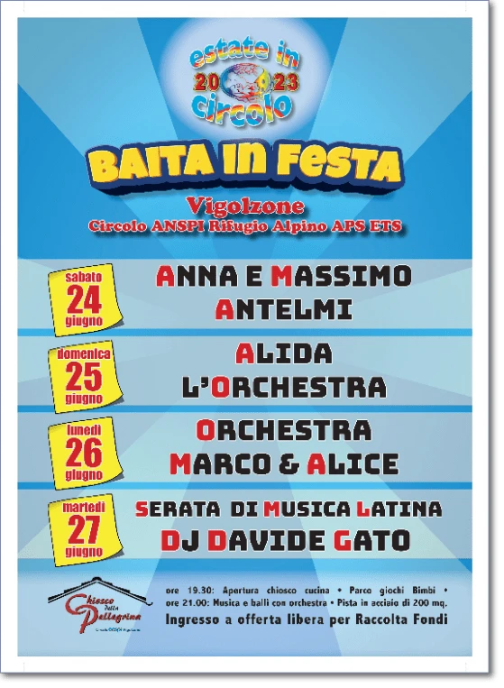 Baita in Festa a Vigolzone dal 24 al 27 giugno con il Circolo Anspi Rifugio Alpino. Serate con ottima cucina e la possibilità di ballare sulla pista in acciaio con le orchestre. Infatti nel chiosco della Pellegrina si potranno gustare piatti gustosi e poi ballare con Anna e Massimo Antelmi, Alida l’Orchestra, Marco e Alice e nella serata finale: Musica Latina con il Dj Davide Gato.