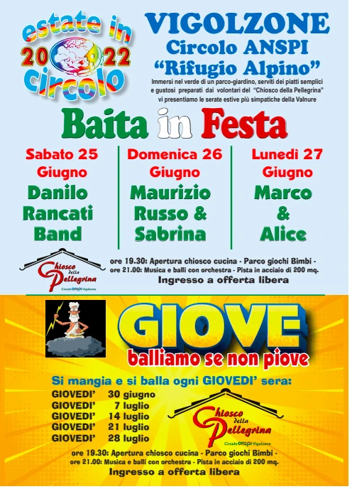 Baita in Festa a Vigolzone dal 25 al 27 giugno. Grazie all’Anspi Rifugio Alpino nella tre giorni non mancheranno: allegria, buon cibo, buon vino. Inoltre si può ballare su pista in acciaio con le orchestre: Danilo Rancati Band, Maurizio Russo e Sabrina, Marco e Alice.