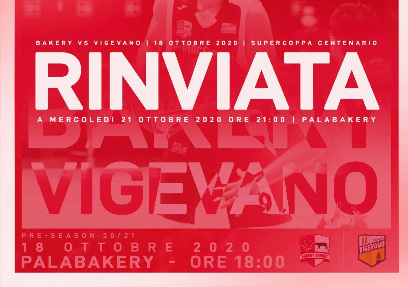 La Bakery Piacenza comunica un altro rinvio. In seguito alla persistente positività al Covid 19 di nove tesserati della Elachem Vigevano, la partita valevole per il girone B della Supercoppa Centenario, in programma questa sera 31 Ottobre, verrà rinviata a data da destinarsi.