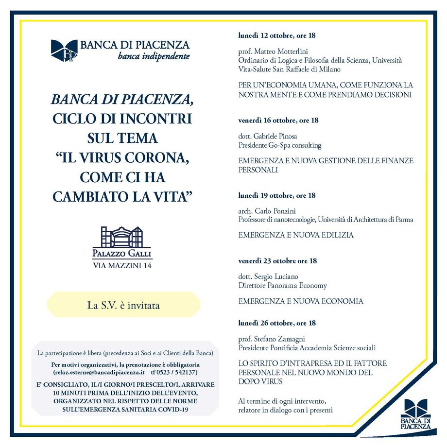 Nell’ambito dell’Autunno culturale di Palazzo Galli la Banca di Piacenza organizza un ciclo di conferenze (tutte alle ore 18) sul tema “Il Virus Corona, come ci ha cambiato la vita”. Primo appuntamento lunedì 12 ottobre con il prof. Matteo Motterlini, Ordinario di Logica e Filosofia della Scienza dell’Università Vita-Salute San Raffaele di Milano: “Per un’economia umana, come funziona la nostra mente e come prendiamo decisioni”, l’argomento che svilupperà nella sua relazione.