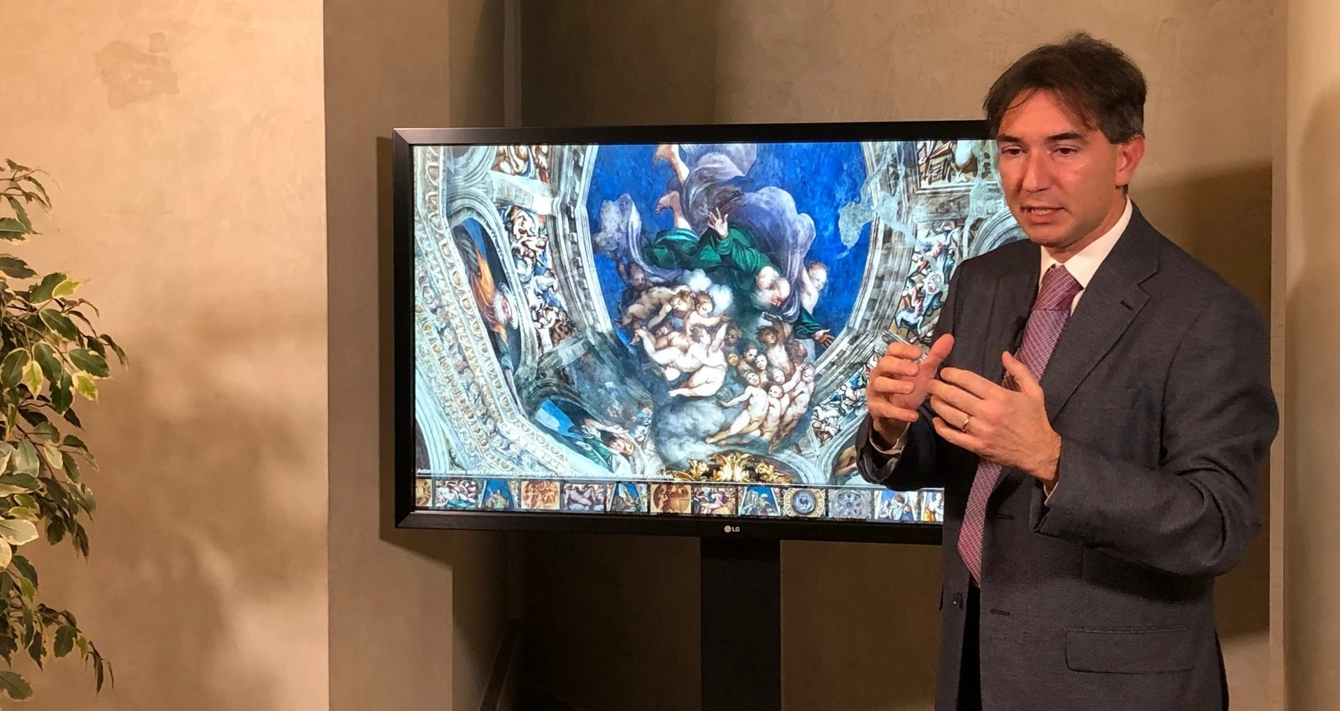 Marco Stucchi («grazie alla Banca, sempre attiva e sensibile alla cultura locale») ha mostrato i contenuti della visita virtuale – che i clienti potranno effettuare appunto dal salone della sede centrale, dove è stato posizionato un touchscreen – alla chiesa custodita dai Frati minori e alla Salita al Pordenone. Il progetto di apre con una home page che ricorda l’inaugurazione della Salita del 4 marzo 2018, molto affollata nonostante un’abbondante nevicata, poi il visitatore – scorrendo le immagini che si trovano nella parte bassa dello schermo a 55 pollici – può muoversi a piacimento all’interno della Basilica (mostrati particolari degli affreschi di Antonio de’ Sacchis: la cappella di Santa Caterina, il Sant’Agostino, la cupola, punto d’arrivo della Salita e alcuni particolari inediti dei musici realizzati dal pittore friulano nella cupolina della cappella della Natività).