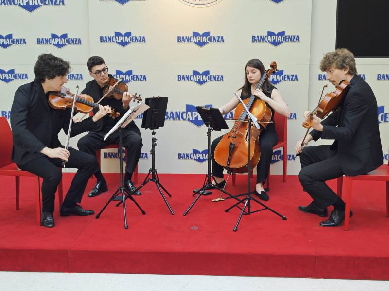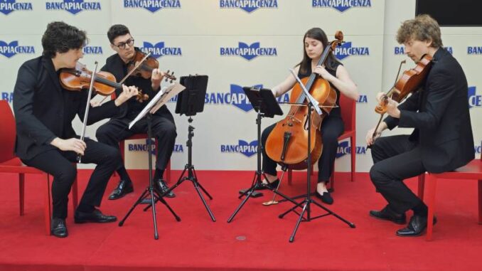 È stato un successo, decretato dai convinti applausi del pubblico presente in Sala Corrado Sforza Fogliani del PalabancaEventi, il concerto di musica da camera eseguito dal Quartetto d’archi dell’Orchestra Giovanile Luigi Cherubini formato da Ludovico Furlani (violino I), Aleardo Brutti (violino II), Alvise Berto (viola), Claudia Notarstefano (violoncello). Un’iniziativa della Società dei Concerti di Piacenza – sostenuta dalla Banca di Piacenza – che prevede altri due appuntamenti, a settembre e a ottobre. Michele Rossi, della Società dei Concerti, ha ringraziato l’Istituto di credito per la collaborazione e ricordato come quello della Cherubini abbia rappresentato un ritorno a Palazzo Galli, dopo che nel 2005 il maestro Muti provò con l’orchestra giovanile nella stessa sala, lodandone l’acustica.