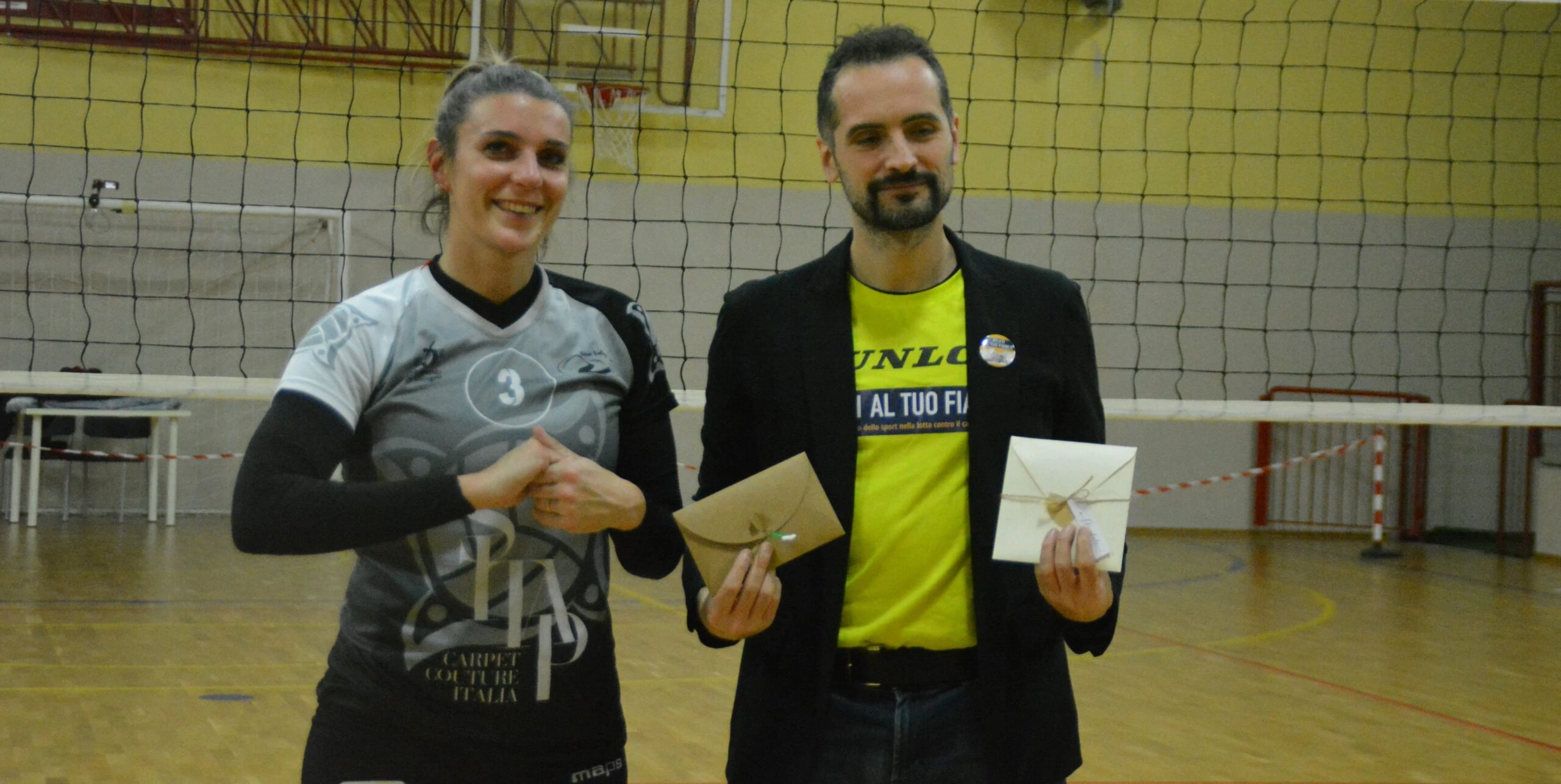 Prima del fischio iniziale dell’ultima gara di campionato, vinta dalla Pallavolo San Giorgio contro la Po. Riva, il capitano Micaela Perini ha donazione a favore dell’associazione onlus.