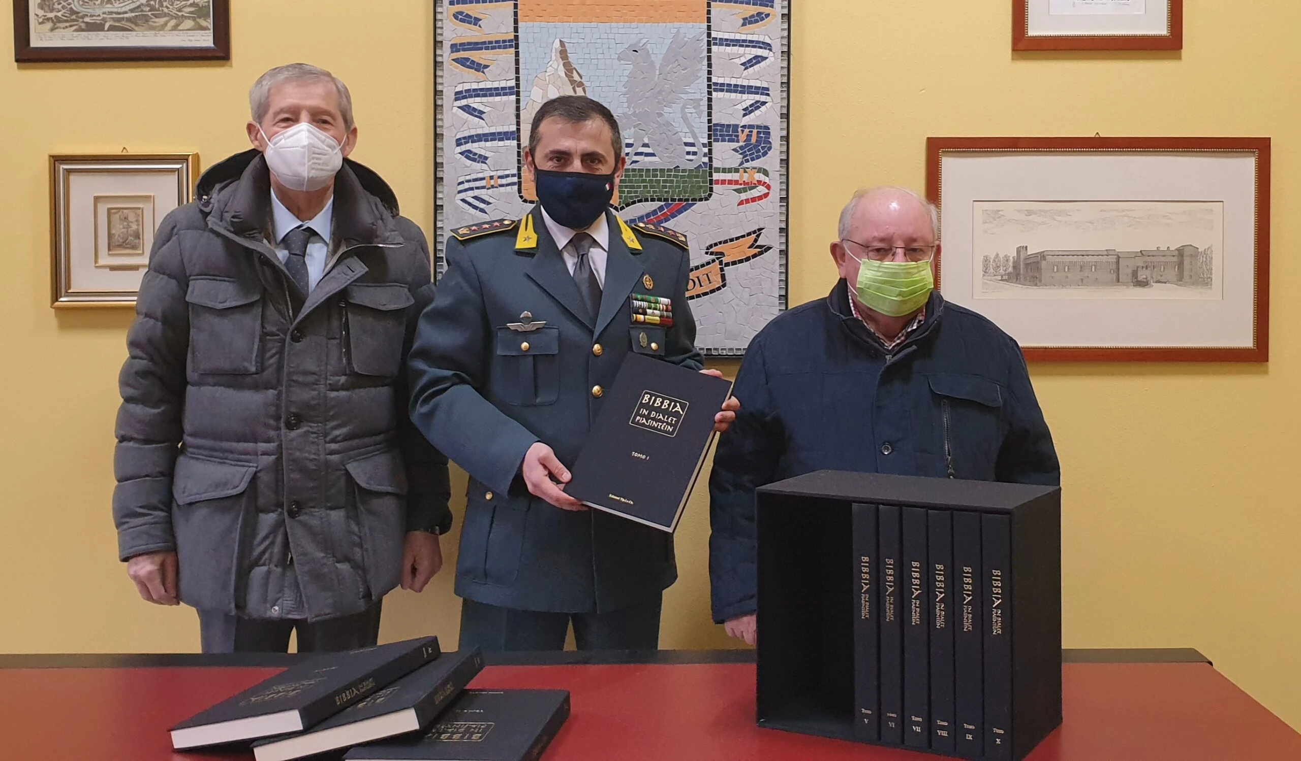 Nella mattinata odierna, giovedì 28 gennaio, presso la caserma Luigi Galli, sede del Comando Provinciale della Guardia di Finanza di Piacenza, ha avuto luogo un breve ma significativo incontro tra Comandante Provinciale – Colonnello Daniele Sanapo e Luigi Zuccheri – autore della traduzione, in dialetto piacentino, della Sacra Bibbia, unitamente all’editore della originale iniziativa – dott. Gianfranco Curti.