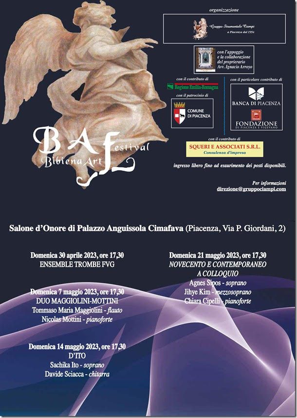 Domenica 30 aprile 2023 ha inizio il BAF – Bibiena Art Festival 2023 che vedrà realizzata una serie di appuntamenti che proseguono fino al 21 maggio attraverso la proposta di iniziative musicali organizzate dal Gruppo Strumentale Ciampi, secondo il calendario allegato.