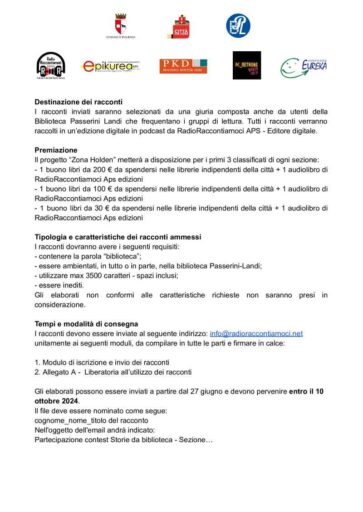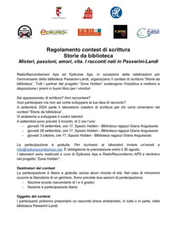 Radio Raccontiamoci Aps ed Epikurea Aps, in occasione delle celebrazioni per l’anniversario della biblioteca Passerini-Landi, organizzano il contest di scrittura “Storie da biblioteca”. Tutti i partner del progetto “Zona Holden” sostengono l’iniziativa e mettono a disposizione i premi in buoni libro per i vincitori. Inoltre, per chi vorrà cimentarsi nel contest a settembre 2024 Epikurea Aps eRadio Raccontiamo APS, all’interno del progetto “Zona Holden”, organizzeranno un laboratoriocreativo di scrittura.