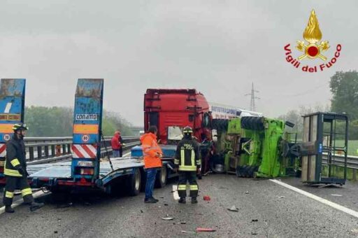 La bisarca, che trasportava una gru, si è ribaltata: tre, dunque, i mezzi di grandi dimensioni che hanno interrotto la carreggiata.