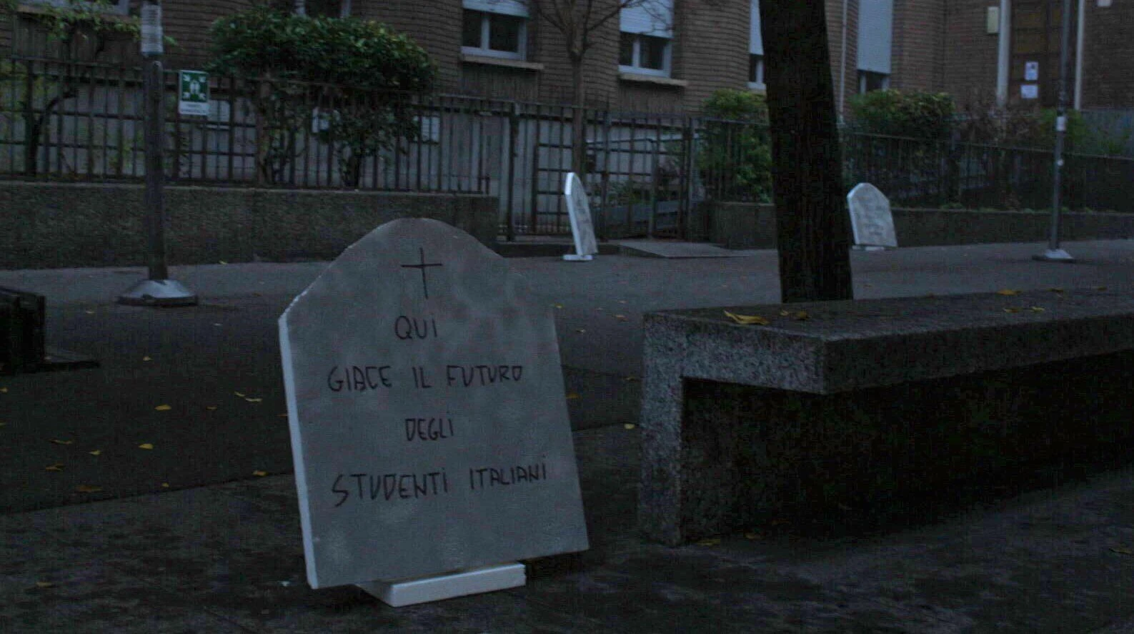 “Qui giace il futuro degli studenti italiani” – recita così una delle frasi riportate sui cartonati a forma di lapide posizionati davanti alle scuole dai militanti del Blocco Studentesco.
