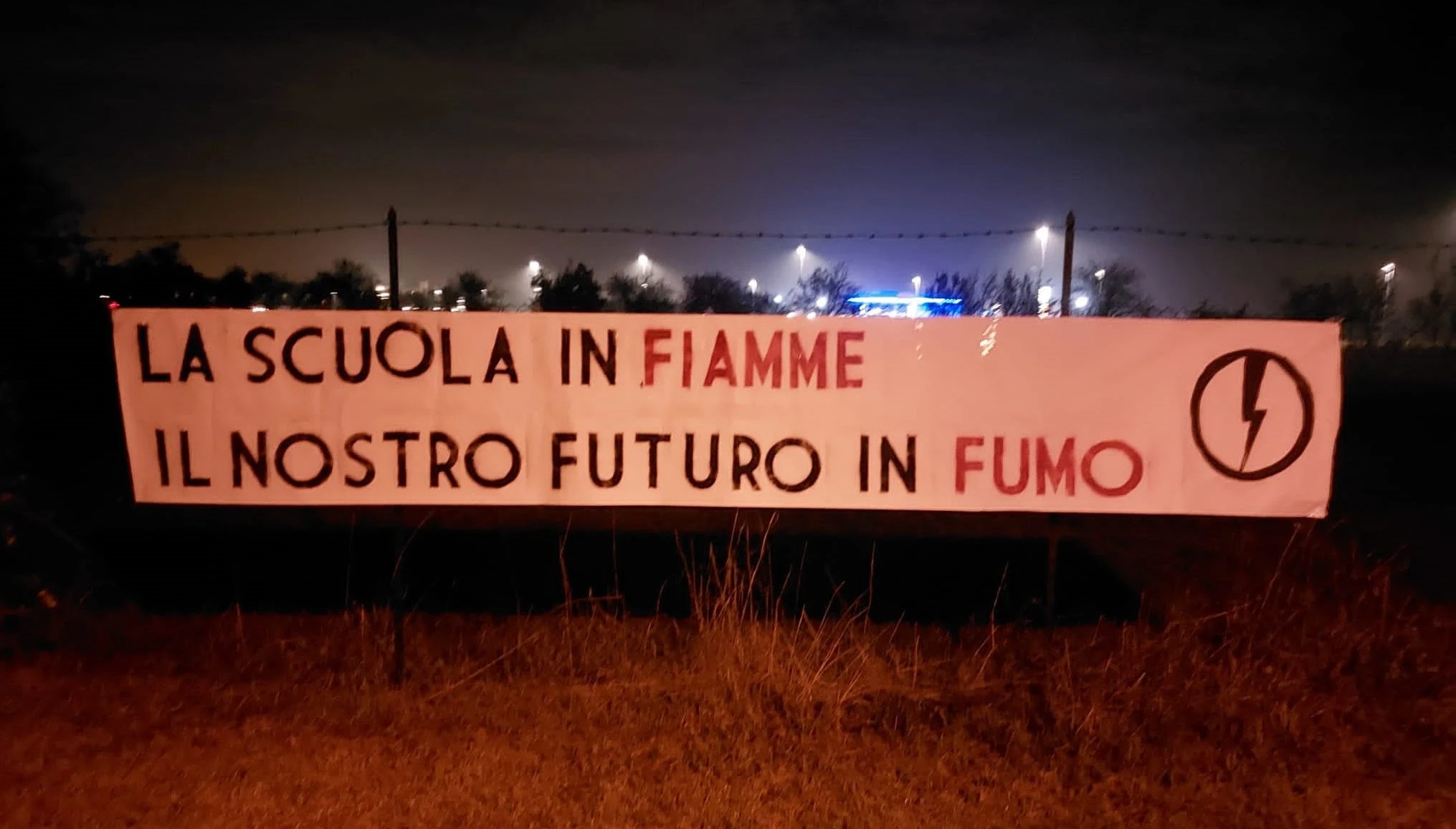 “La scuola in fiamme, il nostro futuro in fumo”. Questa la frase riportata sullo striscione affisso dai militanti del Blocco Studentesco Piacenza per protestare contro le condizioni in cui versano gli istituti piacentini.