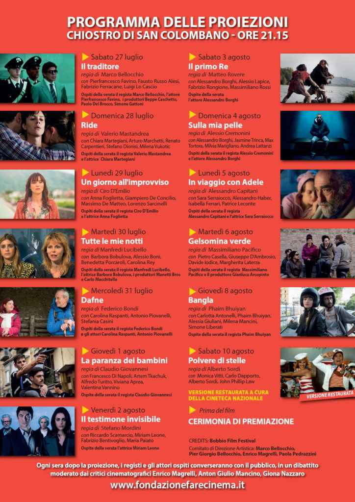 La ventitreesima edizione della rassegna bobbiese è particolarmente ricca: tra i titoli in cartellone, oltre al citato “Il traditore”, ricordiamo “La paranza dei bambini”, “Il testimone invisibile”, “Il primo Re”, “Sulla mia pelle”; tra gli ospiti, Pierfrancesco Favino, Alessandro Borghi, Miriam Leone, Anna Foglietta, Chiara Martegiani, ma anche i registi Valerio Mastandrea, Ciro d’Emilio, Manfredi Lucibello, Federico Bondi, Alessio Cremonini, Alessandro Capitani, Massimiliano Pacifico e molti altri.
