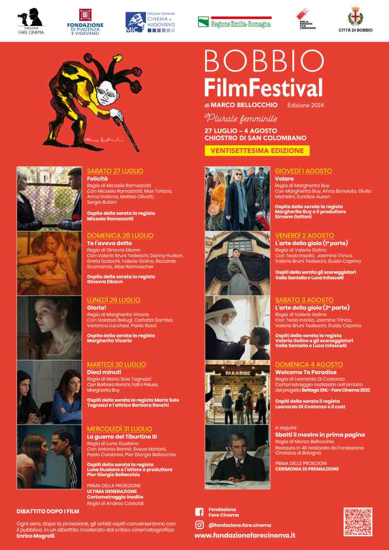 Sabato 27 luglio l’apertura del Festival è affidata a Felicità, esordio alla regia di Micaela Ramazzotti, protagonista poi dell’incontro con il pubblico al termine della proiezione del film, pluripremiato ai Globi d’Oro e ai Nastri d’Argento 2024. A seguire, il 28 luglio, Te l’avevo detto per la regia di Ginevra Elkann, alla sua seconda esperienza dietro la macchina da presa e per la prima volta ospite del Bobbio Film Festival. Verrà proiettato la sera del 29 luglio Gloria! dell’attrice e cantautrice Margherita Vicario, opera pop che ha ricevuto numerosi riconoscimenti a livello nazionale ed internazionale tra cui il Globo d’oro 2024 come Miglior Opera Prima e il Premio della Giuria al Seattle International Film Festival.