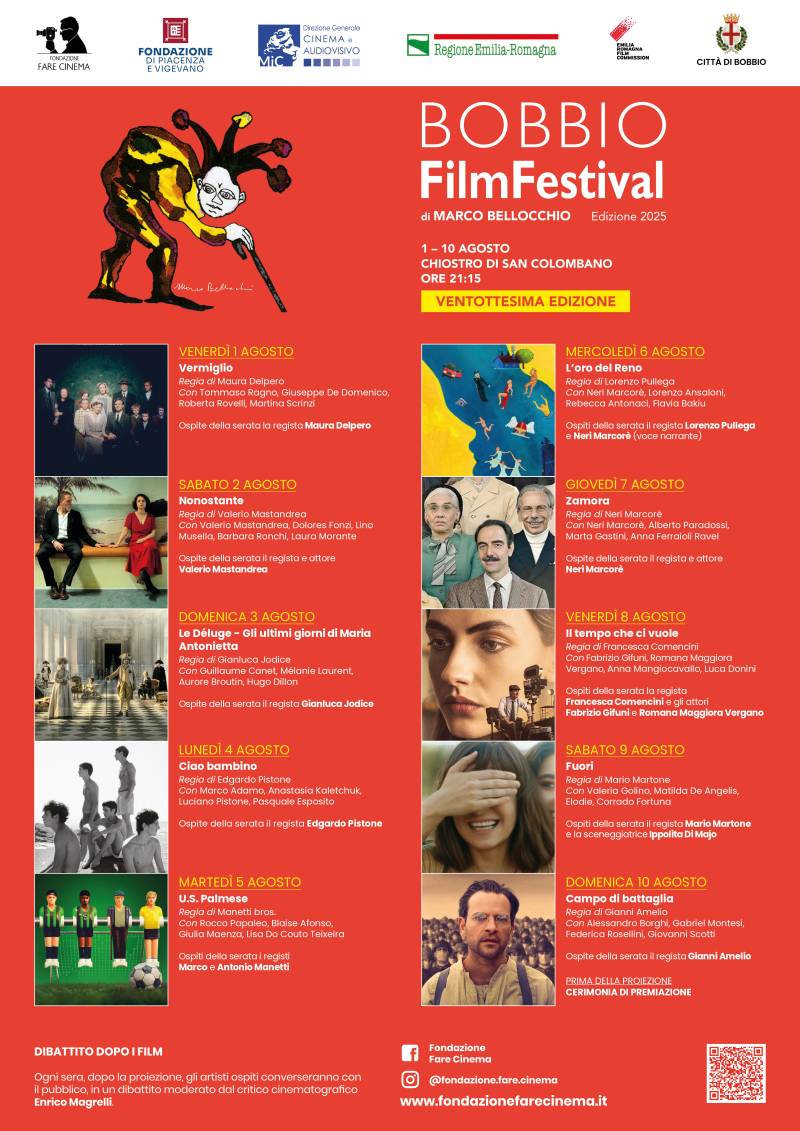 Domenica 3 Gianluca Jodice presenterà al pubblico del Festival il suo Le deluge. Gli ultimi giorni di Maria Antonietta, mentre lunedì 4 agosto toccherà a Ciao Bambino opera prima di Edgardo Pistone, poi sul palco di Bobbio.