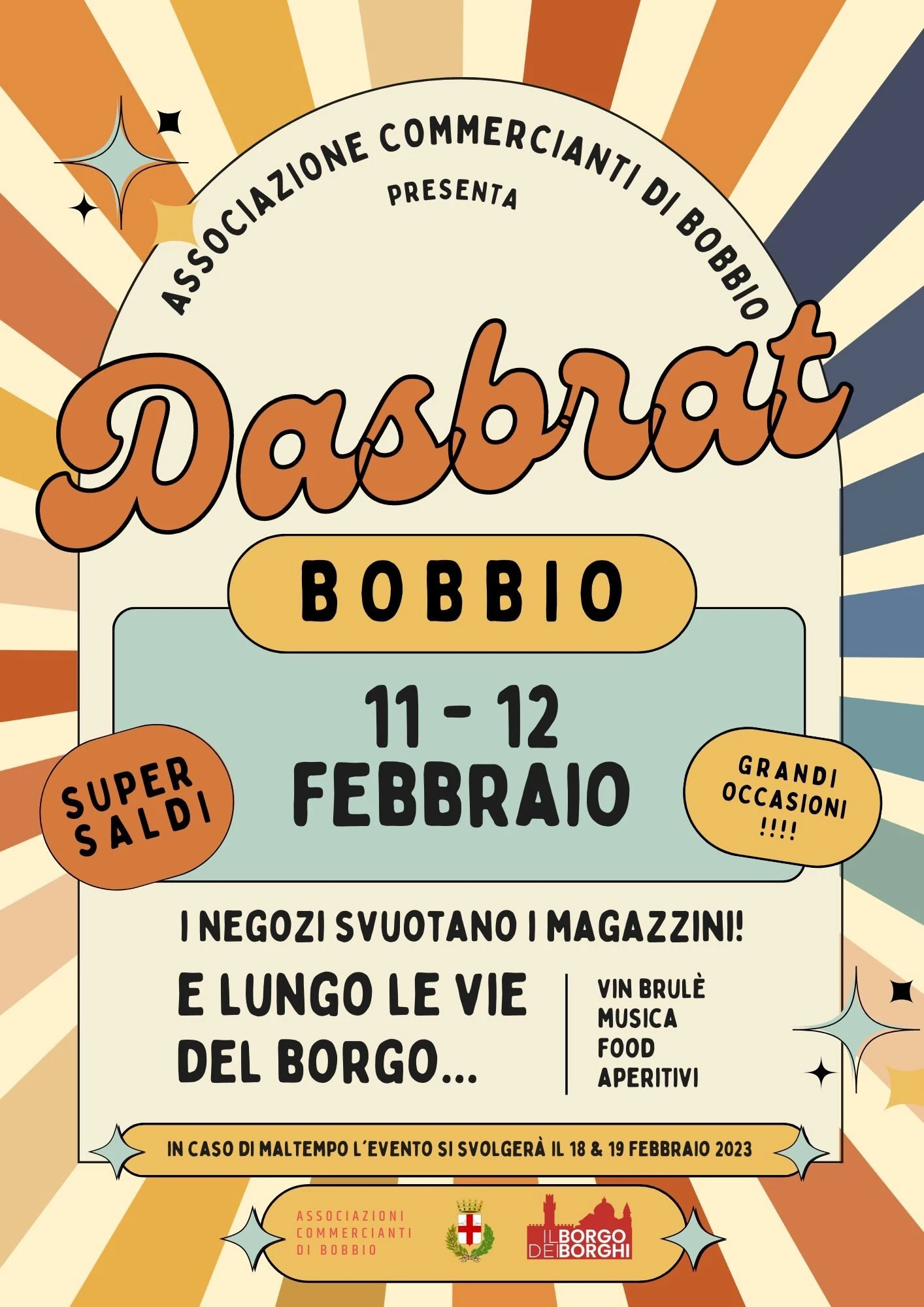 Ritorna a Bobbio il tradizionale Ar Dasbrat, l’evento organizzato dai Commercianti di Bobbio è in programma sabato 11 e domenica 12 febbraio. Per l’occasione tutte le vie del centro di Bobbio saranno vestite a festa. In negozi svuoteranno i magazzini per fare spazio alla nuova collezione.