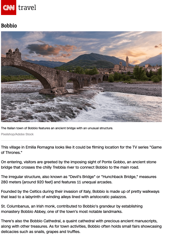 “Generalmente i viaggiatori che scelgono l’Italia per le vacanze, prediligono destinazioni di grandi nomi come Venezia, Firenze, Roma e persino Napoli” – afferma la redattrice nell’articolo – “eppure il Paese offre al turista oltre 5mila splendidi borghi poco popolati, caratterizzati da ottimo cibo e paesaggi incontaminati. Tra questi spicca Bobbio, con le sue affascinanti architetture, come il singolare “Ponte Gobbo” che accoglie i visitatori all’arrivo, potrebbe essere la location perfetta per le riprese della nota serie TV “Il Trono di Spade”.