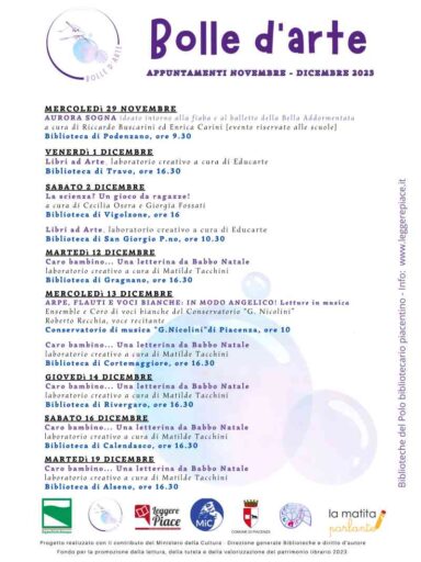Bolle d’arte seconda edizione riparte a fine novembre. Il festival di promozione alla lettura dedicato a bambini/e e ragazzi/e organizzato dal Polo bibliotecario piacentino e realizzato con il contributo del Ministero della Cultura – Direzione generale Biblioteche e diritto d’autore Fondo per la promozione della lettura, della tutela e della valorizzazione del patrimonio librario 2023.