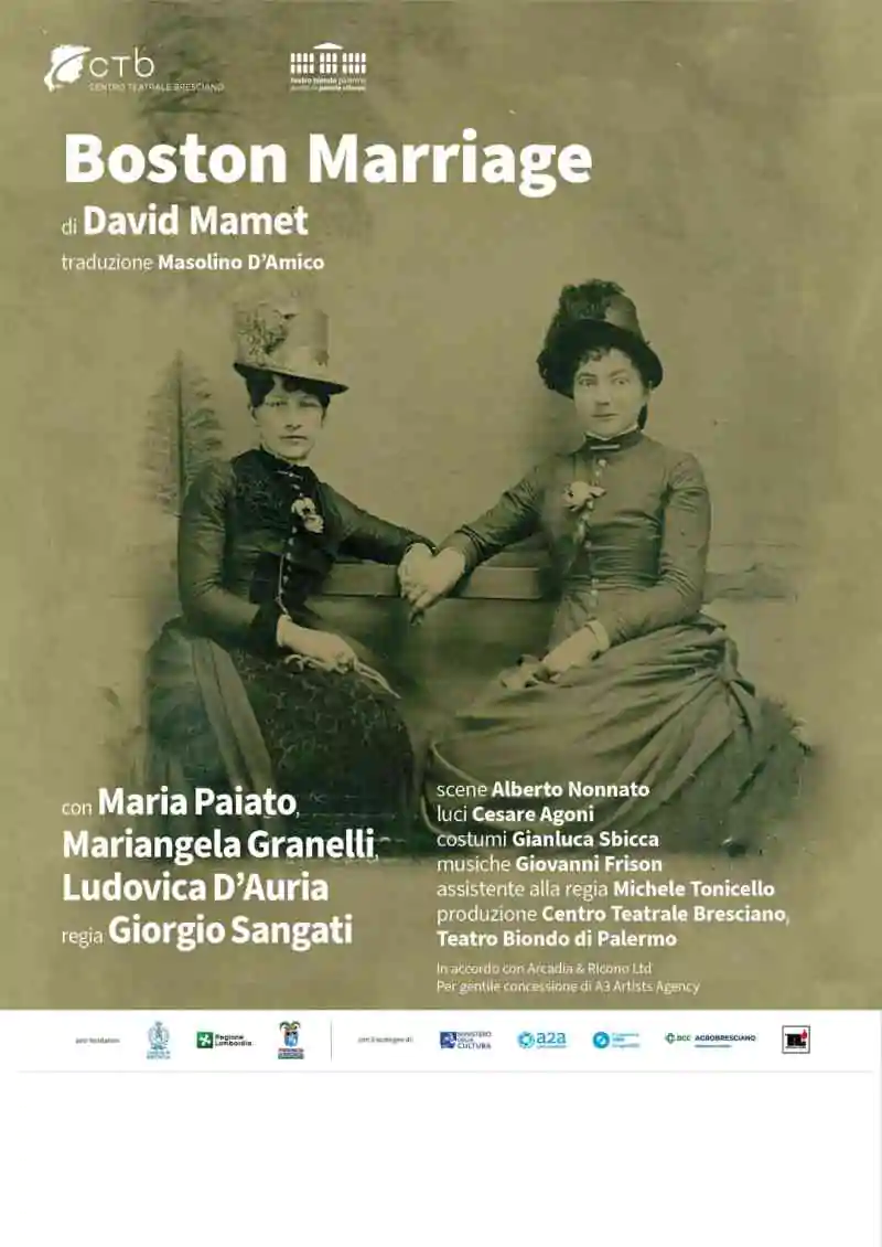 Lo spettacolo è “BOSTON MARRIAGE”, produzione Centro Teatrale Bresciano e Teatro Biondo di Palermo, in programma al Teatro Municipale di Piacenza martedì 4 e mercoledì 5 marzo alle ore 21 per la Stagione di Prosa curata da Teatro Gioco Vita, direzione artistica di Diego Maj e Jacopo Maj, con Fondazione Teatri e Comune di Piacenza, con il sostegno di Fondazione di Piacenza e Vigevano e Iren.
