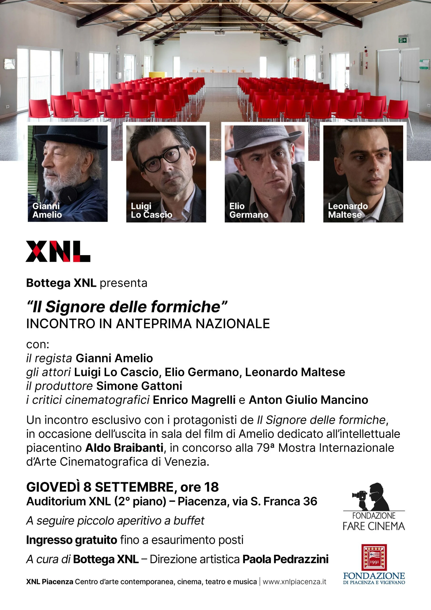 Giovedì 8 settembre 2022 alle ore 18.00 Bottega XNL, in occasione dell’uscita nelle sale del film Il Signore delle formiche, organizza un incontro aperto al pubblico con il regista Gianni Amelio, i protagonisti Luigi Lo Cascio, Elio Germano e Leonardo Maltese e il produttore Simone Gattoni.