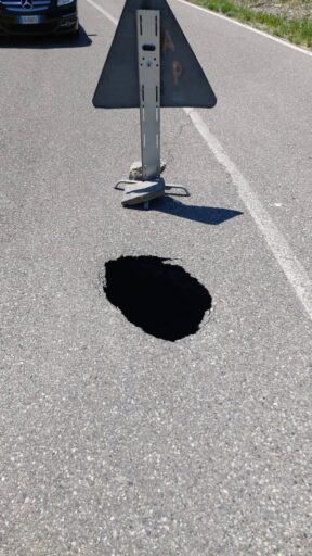Cede l’asfalto e lungo la strada si forma una profonda voragine. E’ accaduto questo pomeriggio lungo la Provinciale 21 nei pressi di Morfasso. Non sono chiare le cause che hanno portato al collasso del manto stradale. Il tratto di carreggiata interessato dal cedimento è percorribile con senso unico alternato e sul posto sono intervenuti i tecnici incaricati di riparare il danno.