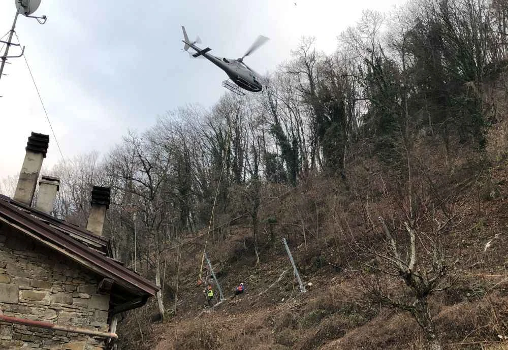 Spettacolare parte dell’intervento realizzato con l’aiuto di un elicottero che, per velocizzare i tempi, ha posato il materiale metallico.