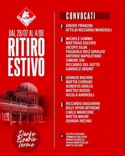 Sabato 27 luglio ci sarà la presentazione ufficiale allo stadio Garilli, quindi verso le 17:00 al campo Bertocchi si svolgerà il primo allenamento della stagione 2024/2025. Intanto la società fa sapere i convocati per il ritiro di Darfo Boario: Franzini, Morosoli, Somma, Solerio, Silva, Giraldo, Napoletano, Iob, Del Dotto, Argint, Bachini, Corradi, Grieco, Russo, Andreoli, Bassanini, Bitihene, Manicone, Mauri, Recino.