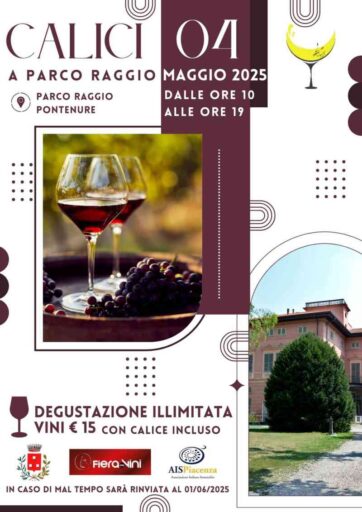 Calici a Parco Raggio è l’evento che celebra il buon bere e il cibo artigianale in programma domenica 4 maggio dalle 10,00 alle 19,00 all’interno dell’incantevole Parco Raggio a Pontenure. In un percorso immerso nella natura si potranno degustare vini prodotti da oltre 20 cantine, birra artigianale e assaggiare prodotti gastronomici locali e non: dall’olio dei nostri colli, alle specialità pugliesi, al gelato e dolci prodotti nel paese.