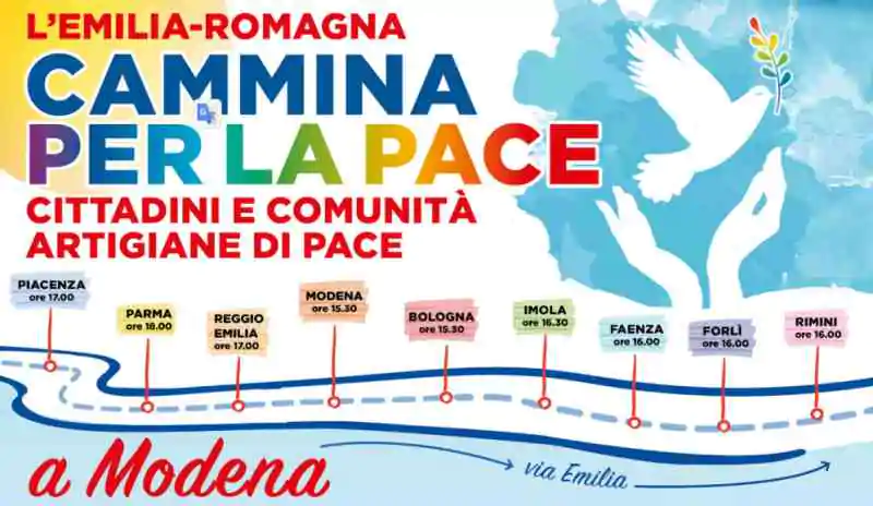 Un popolo della pace che il 1° gennaio 2025 – in occasione della 58^ Giornata internazionale della pace – ha deciso di camminare insieme su tutta la regione, organizzando iniziative nonviolente, contemporanee e coordinate, a Bologna, Faenza, Forlì, Imola, Modena, Parma, Piacenza, Reggio Emilia e Rimini.