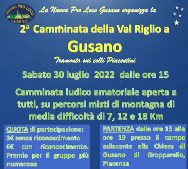 Camminata e grigliata con musica sabato 30 luglio a Gusano di Gropparello. La Nuova Pro Loco Gusano associazione di giovani ragazzi volontari impegnati nell’organizzazione della storica Festa delle Castagne di Gusano organizza per il secondo anno consecutivo la “Camminata della Val Riglio – tramonto sui colli piacentini”.