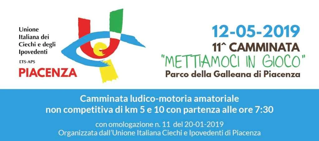 Camminata “Mettiamoci in gioco” con l’Unione Italiana Ciechi e Ipovedenti di Piacenza. Domenica 12 maggio è in programma l’11° camminata ludico-motoria amatoriale. In particolare si tratta di una manifestazione non competitiva di km 5 e 10. Partenza alle ore 7.30 dal Parco della Galleana.