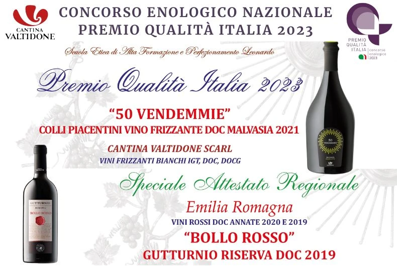 Ancora una volta Cantina Valtidone convince la commissione e ottiene a Città Sant’Angelo il prestigioso riconoscimento “Premio Qualità Italia 2023” per il 50 Vendemmie Colli Piacentini Malvasia DOC frizzante, nella categoria vini frizzanti bianchi IGT, DOC, DOCG del Concorso Enologico Nazionale, organizzato dalla “Scuola Etica di Alta Formazione e Perfezionamento Leonardo”.