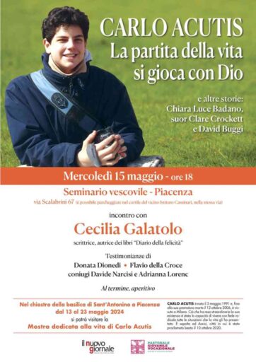 Carlo Acutis, la partita della vita si gioca con Dio è il titolo dell’incontro in programma mercoledì 15 maggio alle ore 18 al Seminario vescovile di via Scalabrini a Piacenza, nella cornice di alcuni eventi che in diocesi sono dedicati al 15enne milanese proclamato beato il 10 ottobre 2020 (tra cui la mostra sui miracoli eucaristici in Sant’Antonino e l’intitolazione della casa dei ragazzi a Mareto).