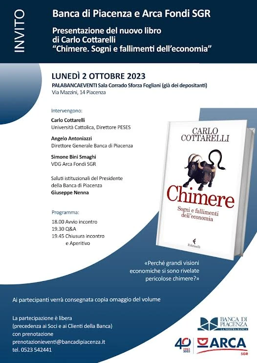 Lunedì 2 ottobre, alle 18, al PalabancaEventi (Sala Corrado Sforza Fogliani, già dei depositanti) l’economista Carlo Cottarelli presenterà la sua ultima fatica editoriale, “Chimere. Sogni e fallimenti dell’economia” (Feltrinelli). Un appuntamento organizzato da Banca di Piacenza e Arca Fondi SGR. Oltre all’autore, interverranno Angelo Antoniazzi, direttore generale dell’Istituto di credito di via Mazzini e Simone Bini Smaghi, vicedirettore generale di Arca Fondi SGR. I saluti istituzionali saranno portati dal presidente della Banca di Piacenza Giuseppe Nenna.