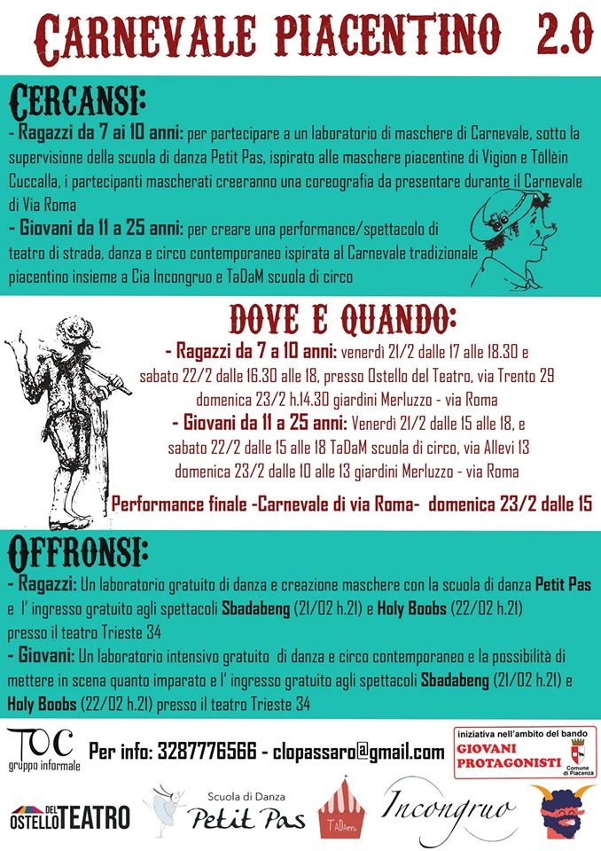 Carnevale Piacentino 2.0 dal 21 al 23 febbraio con il gruppo Toc. Una festa che possa diventare un momento di incontro, socializzazione e coesione cittadina, dove riconoscere, scoprire e valorizzare le nostre radici culturali.