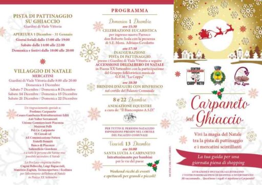 “Siamo molto entusiasti – precisa il Sindaco di Carpaneto Piacentino Andrea Arfani – perché finalmente arriva questo grande momento per il nostro paese. L’occasione sono le feste di Natale, una cornice del tutto nuova con pista di pattinaggio sul ghiaccio, mercatini di Natale, luci, cioccolata, vin brulee, tutto quello che è il vero emblema del Natale.Quest’anno lo ospitiamo nei nostri giardini”.