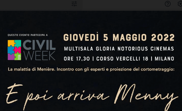 Il Gruppo Otologico della Casa di Cura Piacenza e la Fondazione Mario Sanna ONLUS parteciperanno all’evento che si svolge in occasione della Civil Week 2022 il 5 maggio alle ore 17:30 presso il Cinema Gloria Notorious di Milano e che vedrà mettere in scena la proiezione del cortometraggio ” E POI ARRIVA MENNY | trailer ufficiale on Vimeo “, ideato dalla protagonista Giovanna Gianolli e con la regia di Andrea Traina.