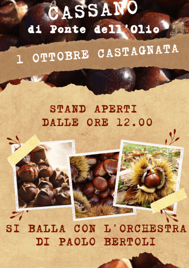 La Castagnata 2023 a Cassano di Ponte dell’Olio domenica 1° ottobre è organizzata dalla Pro loco Amici di Cassano. In caso di maltempo l’evento sarà rinviato a domenica 8 ottobre.