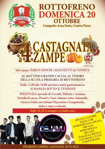 “Domenica 20 ottobre ci sarà la tradizionale castagnata a quattro zampe di Rotofreno – anticipa Sandro Bersani referente della Pro Loco – sperando nella benevolenza del tempo, la mattina c’è la scuola primaria di Rotofreno, che farà una caccia al tesoro. Quest’anno sarà una caccia al tesoro fotografica, i partecipanti dovranno fare delle foto ai monumenti di Rotofreno. Nel primo pomeriggio c’è la sfilata dei cani alle 14.30 mentre le iscrizioni saranno aperte dalle 13.30. Protagonisti cani di razza e cani meticci la sfilata è amatoriale, si tratta comunque di una giornata dedicata ai nostri amici cani. E poi sul palco dalle 16, 16.30 il concerto dei Deja Vu”.