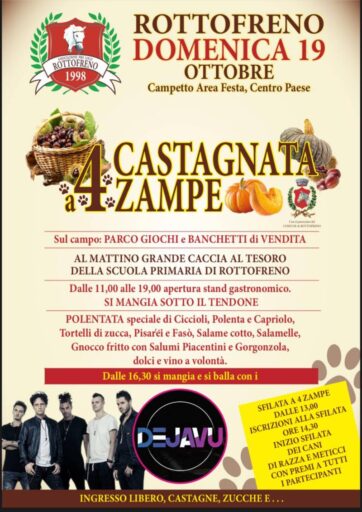 Castagnata a 4 zampe 2025 a Rottofreno il 19 ottobre. La locale Pro Loco propone dal mattino una grande caccia al tesoro, poi dalle 11 e fino a sera si mangia sotto il tendone. Presente lo stand gastronomico con polenta e ciccioli o capriolo e tante specialità piacentine.