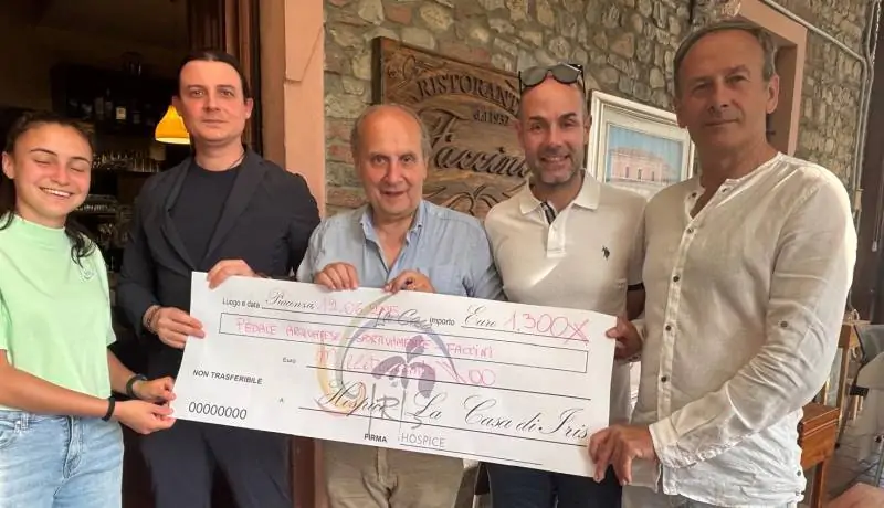 È un assegno di 1.300 euro quello consegnato al presidente dell’Hospice La casa di Iris a Castell’Arquato a “casa Faccini”. Il ricavato è la somma di 800 euro raccolti dall’associazione “Pedale Arquatese”, in collaborazione con Cicli Manini e Lugagnano Off road (con le bici di 100 volani), in occasione della festa “Sportivamente” tenutasi sempre a Castell’Arquato il 31 maggio e 1 giugno. A questi si aggiungono 500 euro donati direttamente da Paola Faccini, titolare dell’omonimo ristorante insieme ai fratelli Massimo e Barbara e al figlio Alessandro Villa Faccini, sempre in prima linea nella raccolta fondi per le associazioni del territorio. Presenti alla consegna dell’assegno il presidente del Pedale Arquatese Antonio Sozzi, la consigliera Comunale Marta Baccanti, Alessandro Villa Faccini e il presidente de La casa di Iris Sergio Fuochi.