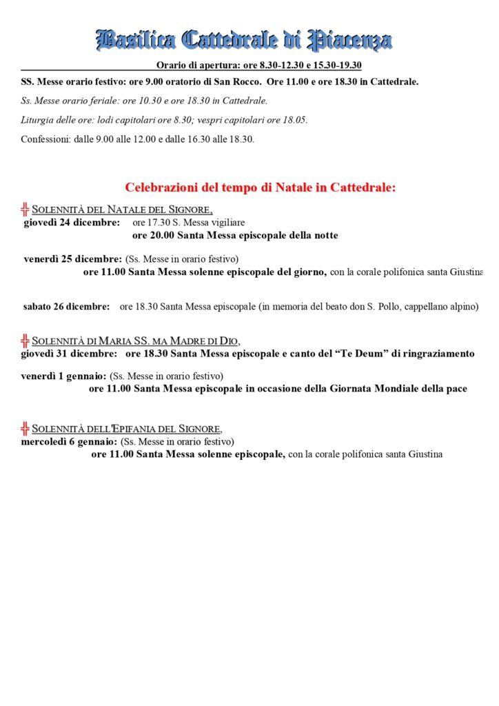 Celebrazioni di Natale, la Diocesi di Piacenza e Bobbio annuncia il programma delle cerimonie in Cattedrale. La Santa Messa di Natale, il 24 dicembre, si terrà alle 20.