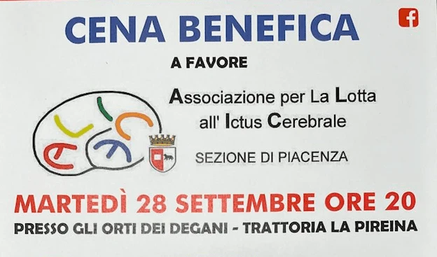 Martedì 28 settembre alle ore 20 è in programma la Cena Benefica a favore dell’Associazione per la Lotta all’Ictus Celebrale, sezione di Piacenza. L’appuntamento è previsto agli Orti dei Degani – Trattoria la Pireina.