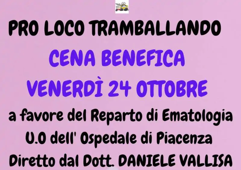 La Pro Loco Tramballando propone la cena benefica a favore del reparto di Ematologia dell’Ospedale di Piacenza, diretto dal Dottor Daniele Vallisa.