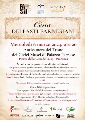 La Cena – introduce Fabrizio Samuelli Direttore di Confesercenti Piacenza – sarà a tema con un menù studiato e dedicato ad Elisabetta Farnese, e con degustazione di vini abbinati. L’evento è ispirato al banchetto nuziale di Elisabetta Farnese con Filippo V di Spagna del 1714.