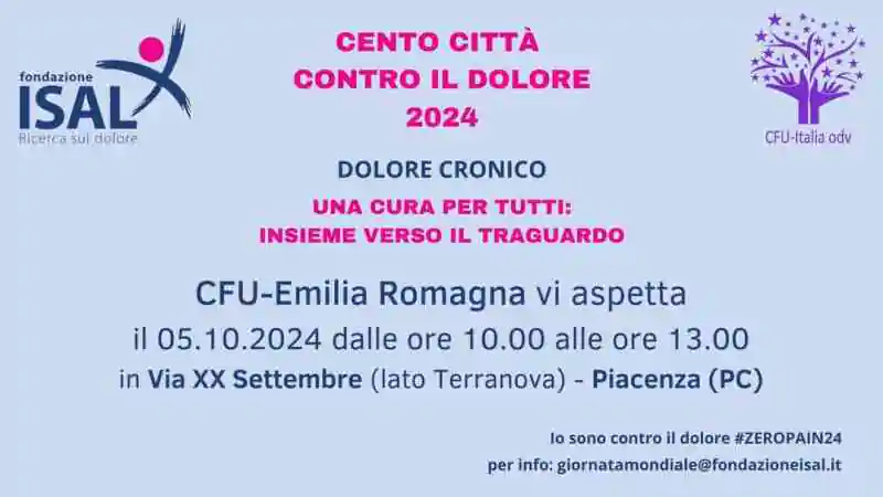 Cento Città contro il dolore, torna nel 2024 a Piacenza con la nuova edizione creata da Fondazione Isal che si occupa di ricerca sul dolore cronico, con l’evento promosso ancora da dall’associazione di volontariato CFU-Italia OdV Comitato Fibromialgici Uniti Sezione di Piacenza.