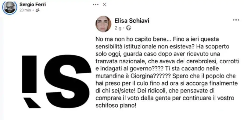 I post diffusi dalla Consigliera Schiavi – intrisi di offese, volgarità e toni del tutto incompatibili con il ruolo istituzionale ricoperto – rappresentano un livello di degrado del confronto politico che non può e non deve trovare cittadinanza nelle istituzioni. Ancora più grave è il fatto che tali espressioni siano state successivamente rivendicate in un ulteriore intervento, a conferma di una totale mancanza di consapevolezza del proprio ruolo.