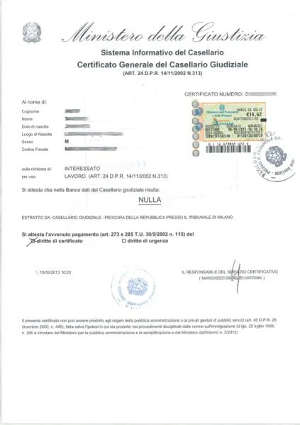 € 3,92 di diritti se non lo si richiede con urgenza, € 7,84 con procedura di urgenza; la richiesta può essere fatta sul sito Ministero della Giustizia, dove sono disponibili i moduli per la richiesta e il modulo per la delega alla presentazione domande e al ritiro del certificato.