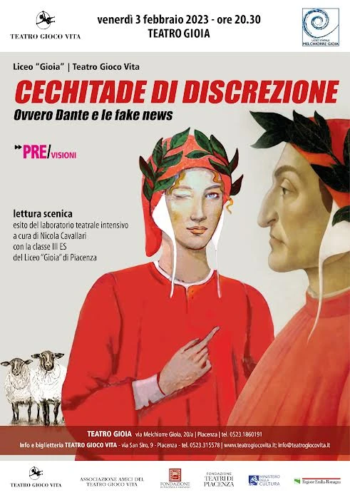 Ce ne parleranno attraverso i linguaggi del teatro i ragazzi e le ragazze della classe III ES del Liceo “Gioia” di Piacenza che venerdì 3 febbraio alle ore 20.30 al Teatro Gioia saranno i protagonisti di “Chechitade di discrezione – Ovvero Dante e le fake news”, esito di un laboratorio teatrale intensivo di Teatro Gioco Vita condotto da Nicola Cavallari.