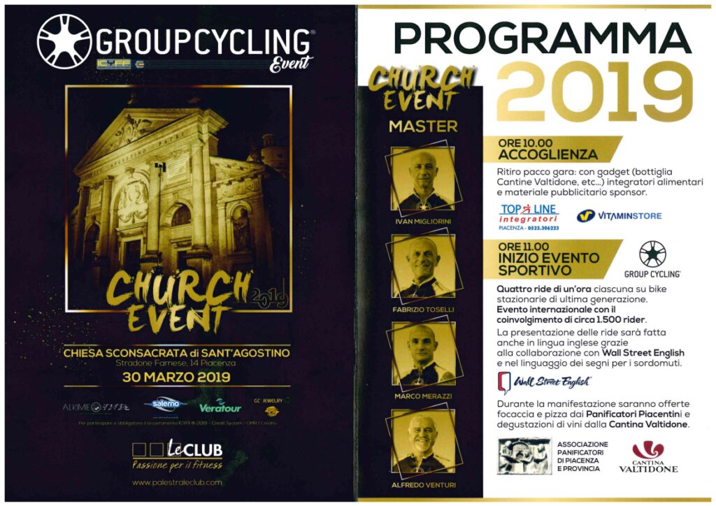Sabato 30 marzo torna Church Event. Oltre mille appassionati di Group Cycling raggiungeranno la chiesa di Sant’Agostino sullo Stradone Farnese per un evento di sport e solidarietà, un appuntamento dal respiro internazionale. Sono previsti infatti partecipanti persino dall’Uruguay. L’evento si svolgerà dalle 11 alle 16,30, suddiviso in quattro ride della durata di circa un’ora ciascuna. Ospite d’onore sarà la campionessa mondiale di ciclismo Giorgia Bronzini.