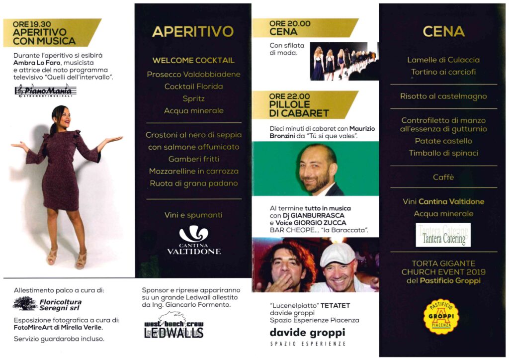 Finito l’evento i partecipanti andranno alla scoperta di Piacenza. Il Comune, infatti, ha organizzato una visita gratuita in alcuni musei della città. Alle 19,30, invece, si tornerà alla chiesa di Sant’Agostino per un aperitivo. Aperitivo accompagnato dalla musica di Ambra Lo Faro. Alle 20 cena e alle 22 spazio al cabaret con Maurizio Bronzini. Al termine dello spettacolo si balla con i dj Gianburrasca e Giorgio Zucca.