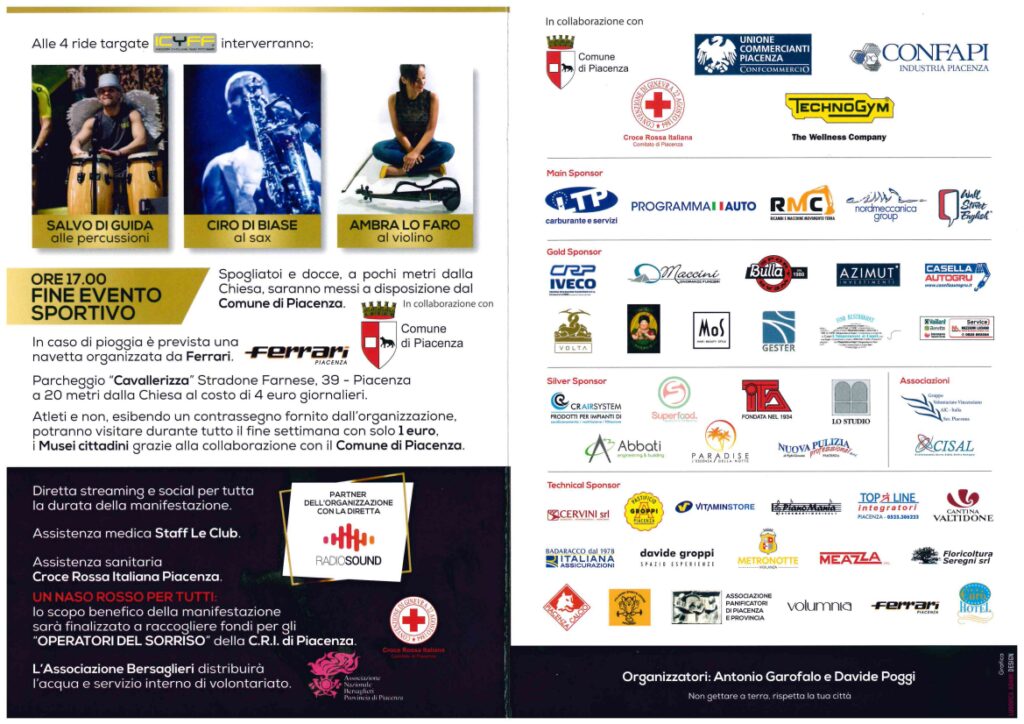 “Quest’anno, buona parte del ricavato andrà agli Operatori del Sorriso della Croce Rossa, che con la loro allegria portano buonumore tra i piccoli pazienti del reparto di Pediatria dell’ospedale di Piacenza. Ogni anno, infatti, cambiamo i destinatari della nostra beneficenza, perché crediamo che la solidarietà non debba essere univoca. Inoltre abbiamo donato mille euro alla Fondazione Pantani che ci ha permesso di portare a Piacenza la bike del mitico Pirata. Sarà presente il presidente della Federazione Group Cycling, Alfredo Venturi. Con lui anche Ivan Migliorini, Fabrizio Toselli e Marco Merazzi, master della federazione”. Lo spiega Davide Poggi, organizzatore dell’evento.